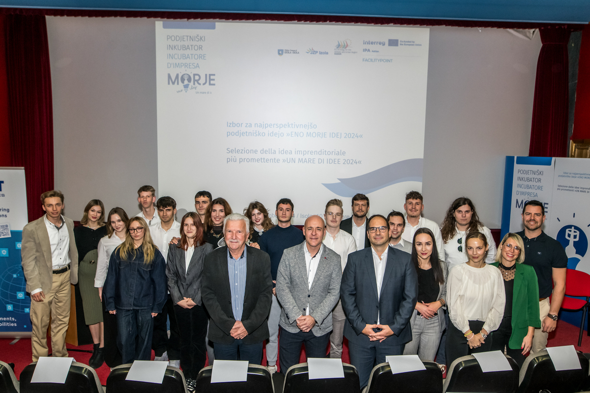 Fotografija je z lanskoletne zaključne prireditve ENO MORJE IDEJ 2024. V ospredju (z leve) so: župan Milan Bogatič, član uprave Dinita Tomaž Lešnik in direktor JZP Izola Iztok Škerlič, v ozadju pa finalisti (vir: JZP Izola/ Branko Furlanič).