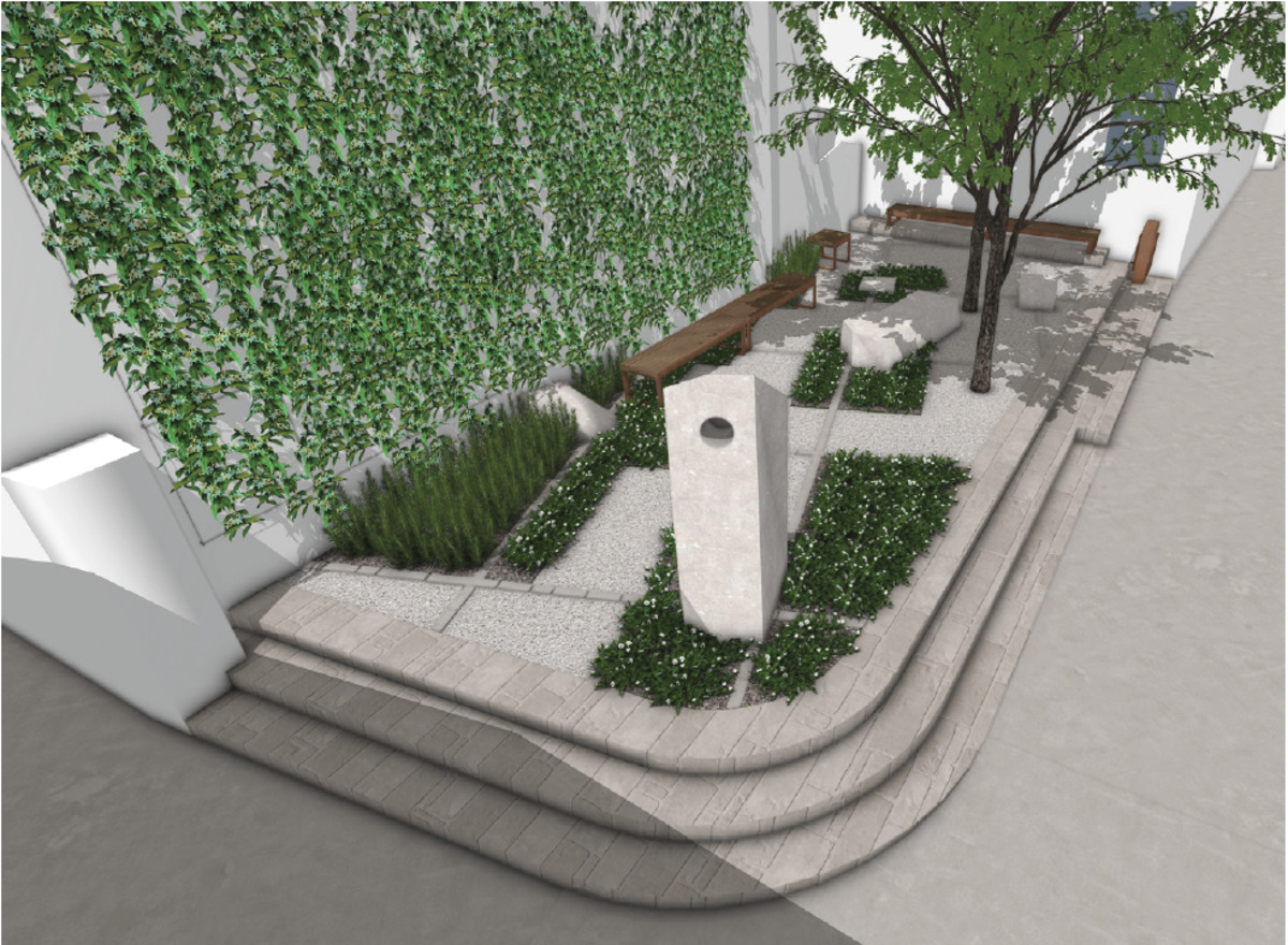 Podjetje Landstudio 015, krajinska arhitektura je izdelalo idejno zasnovo bodoče ureditve, ki predvideva ureditev zelene stene, zasaditev dveh dreves za senco, namestitev klopi in koša za odpadke.