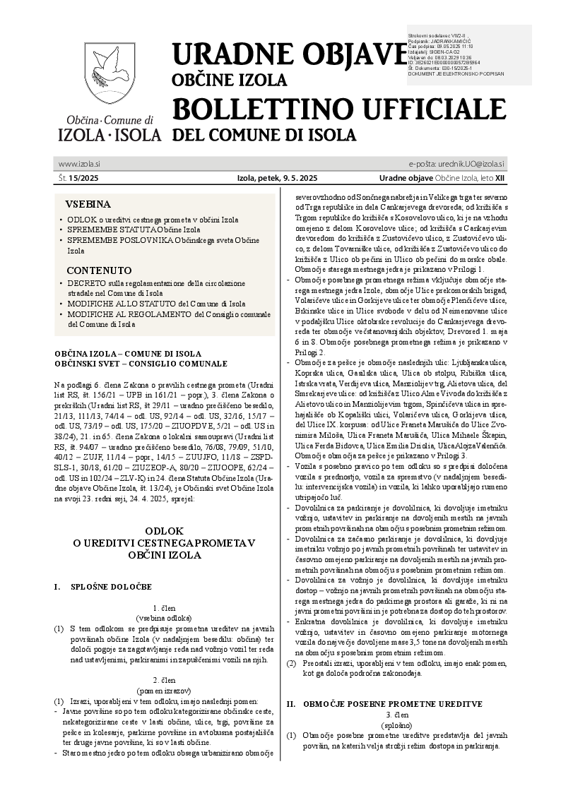 ODLOK o ureditvi cestnega prometa v občini Izola (Uradne objave Občine Izola št. 15/2025)