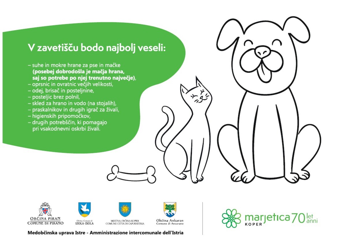 Aprila in maja bo potekala velika zbiralna akcija hrane in drugih potrebščin za Obalno zavetišče za zapuščene živali. Namen akcije je podpreti delovanje zavetišča ter izboljšati življenjske pogoje zapuščenih, najdenih in odvzetih živali na območju slovenske Istre.
