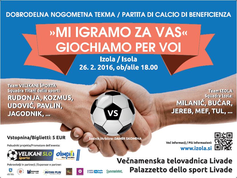 V večnamenski dvorani Livade se bosta v petek pomerili dve zelo zanimivi ekipi: Velikani slovenskega športa, kot so Mladen Dabanovič, Sašo Udovič, Aleš Čeh ipd. in pa znani Izolani s področja gospodarstva, športa in glasbe, kot so Andrej Jereb, Drago Mislej – Mef, Darko Milanić, Admir Sinanbegovič ipd. Dogodek Mi igramo za vas organizirajo Občina Izola, Center za kulturo, šport in prireditve in Športno društvo Olimpiki, ki bo Velikane slovenskega športa tudi pripeljalo v Izolo. Pričakovani prispevek za tekmo oz. donacija znaša 5 evrov, donirati je možno tudi direktno na račun Športnega društva Olimpiki: številka TRR SI56 0201 8026 0833 447, odprt pri NLB d.d., s pripisom/namenom VELIKANI – IZOLA 26. 2. 2016. Zbrana sredstva bodo namenjena izolskim osnovnošolcem (izkupiček bo porazdeljen v šolske sklade vseh treh osnovnih šol). Ravno v času dogodka bo Športno društvo Olimpiki, ki je v postopku pridobitve statusa humanitarne organizacije, obeležilo dve leti uspešnega delovanja. Dogodek bodo popestrili tudi Team Unihive, ki bodo na igrišču blizu telovadnice predstavili svoje društvo in monocikle.