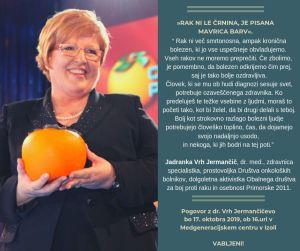Ob priložnosti tedna zdravja bodo v četrtek, 17. oktobra 2019, ob 16.uri v Medgeneracijskem centru v Izoli organizirali tudi predavanje Rak ni le črnina, je pisana mavrica barv. Predavanje in pogovor bo vodila Jadranka Vrh Jermančič, dr. med., zdravnica specialistka, prostovoljka Društva onkoloških bolnikov, dolgoletna aktivistka Obalnega društva za boj proti raku in osebnost Primorske 2011. Predavateljica – zdravnica bo z občinstvom delila bogate izkušnje s področja rakavih bolezni in prostovoljnega dela z bolniki ter odgovarjala na vprašanja.