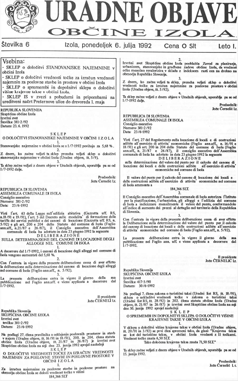 Sklep o novih cenah kanalšcine in odvoza smeti (Uradne objave Občine Izola, št. 6/1992)