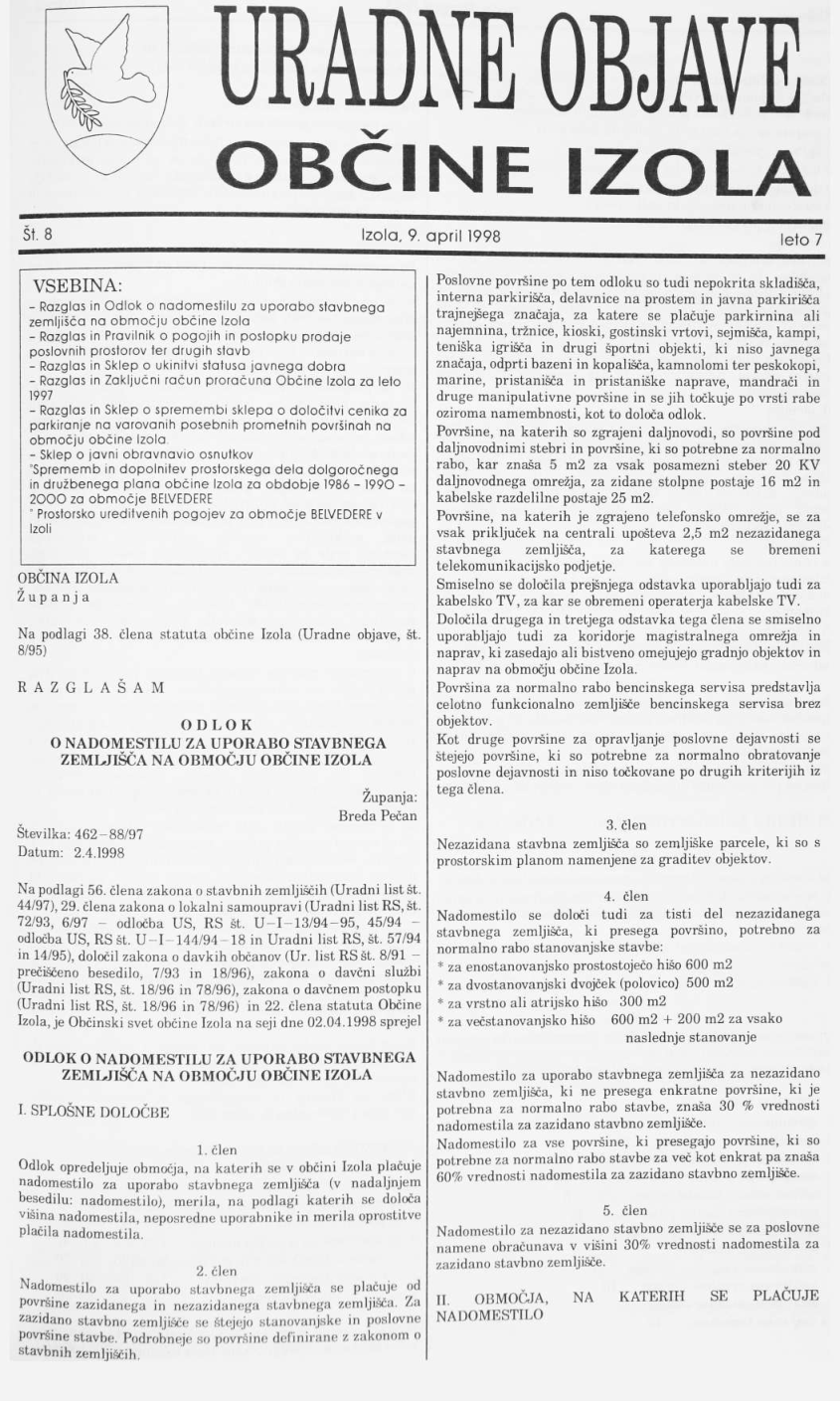 Odlok o nadomestilu za uporabo stavbnega zemljišča na območju občine Izola (Uradne objave Občine Izola, št. 8/1998)
