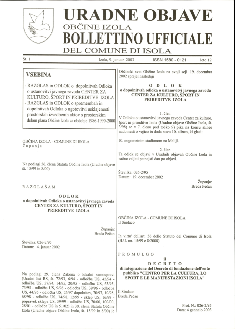 Odlok o dopolnitvah Odloka o ustanovitvi javnega zavoda Center za kulturo, šport in prireditve Izola (Uradne objave Občine Izola, št. 1/2003)