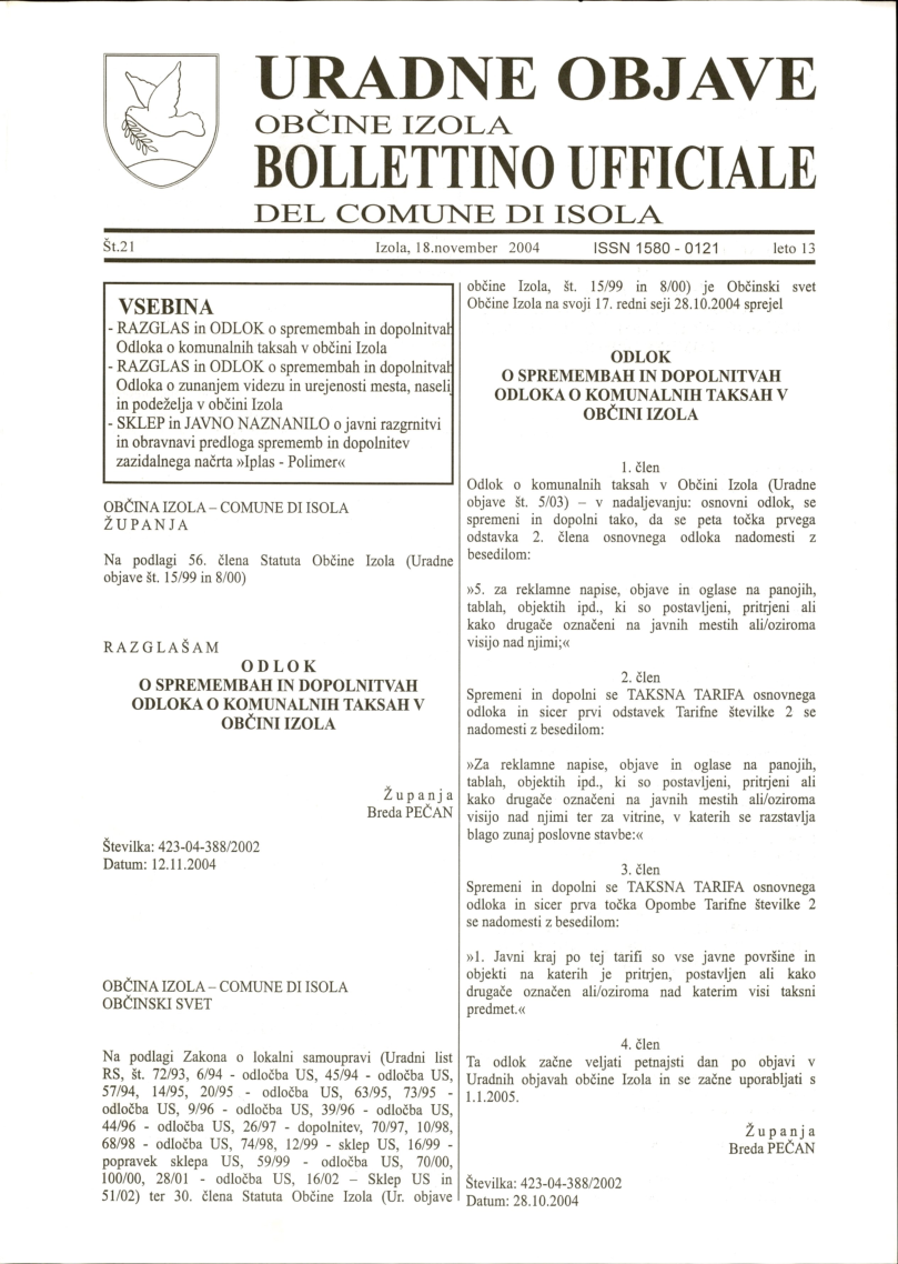 Odlok o spremembah in dopolnitvah Odloka o komunalnih taksah v občini Izola (Uradne objave Občine Izola, št. 21/2004)