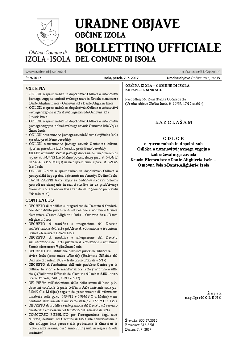 Odlok o spremembah in dopolnitvah Odloka o ustanoviti javnega vzgojno izobraževalnega zavoda Osnovna šola Livade Izola (Uradne objave Občine Izola, št. 9/2017)