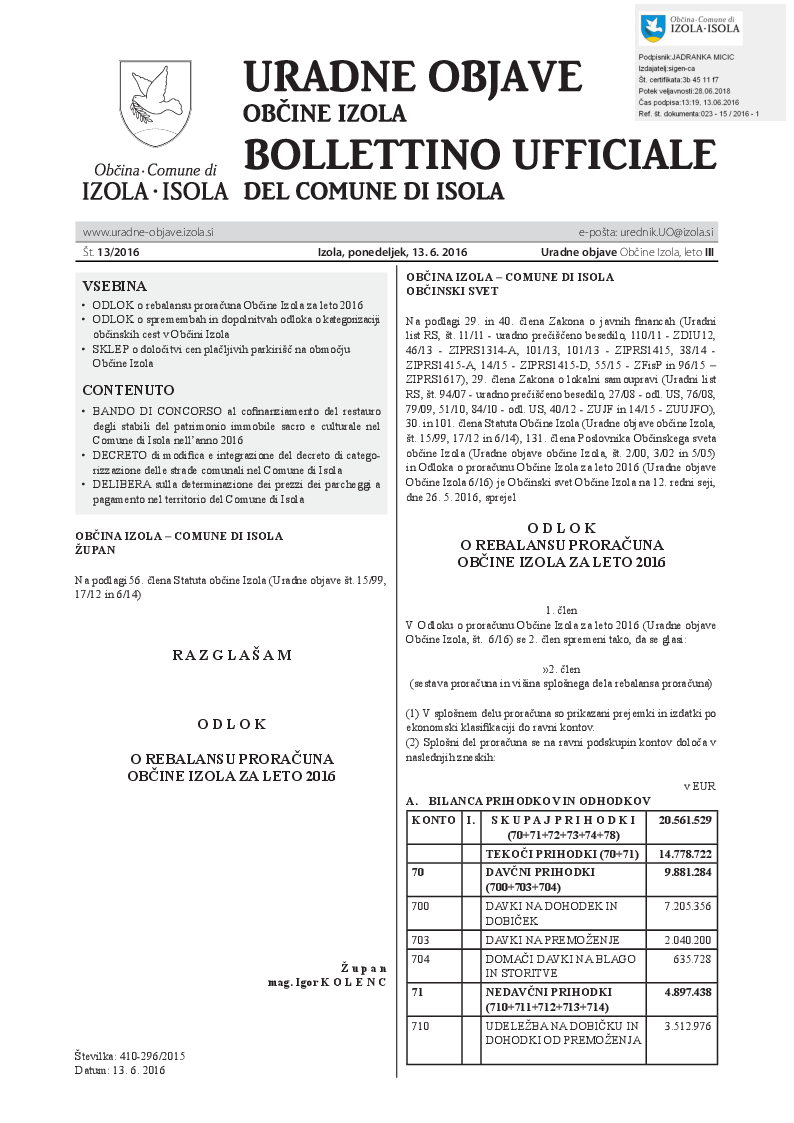 Odlok o rebalansu proračuna Občine Izola za leto 2016 (Uradne objave Občine Izola, št. 13/2016)