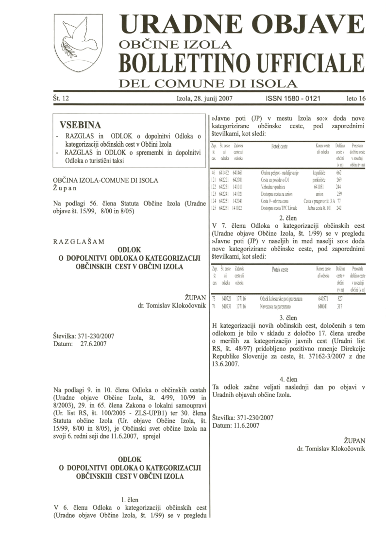 Odlok o dopolnitvi Odloka o kategorizaciji občinskih cest v Občini Izola (Uradne objave Občine Izola, št. 12/2007)