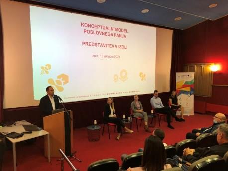 Po krajšem uvodu so študenti podrobno predstavili zasnovo modela t. i. beehive business huba oziroma poslovnega panja – ekosistema dobro organizirane skupine podjetij, ki prek sodelovanja vplivajo na doseganje skupnih koristi. Osrednje podjetje ima ob tem ključno vlogo pri razvoju in rasti, v primeru poslovnega panja so to uveljavljena podjetja iz določene panoge, ki so bodisi horizontalno ali vertikalno povezana z ostalimi podjetji, ki delujejo v okviru panja. Študenti so sicer po podrobni analizi kot potencialno osrednje podjetje poslovnega panja v Izoli prepoznali Dinit Card Services, ki ob 90 zaposlenih nudi napredne storitve na področju procesiranja kartic in plačil.