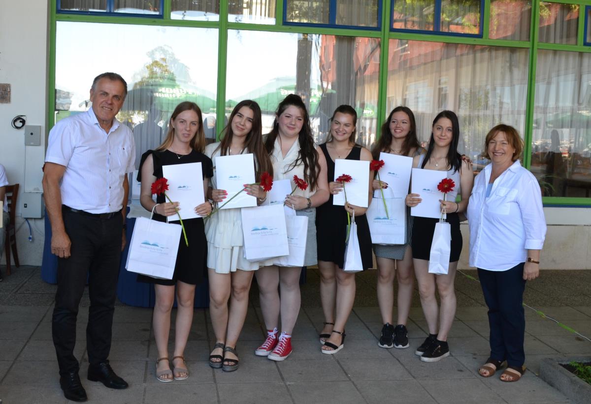 Na fotografiji z leve proti desni: župan Danilo Markočič, dijakinje Celestina Sabadin, Nikolina Novarlić, Špela Pangerc, Lara Kosič, Nina Lisjak in Nika Paljk ter ravnateljica Adelija Perne.