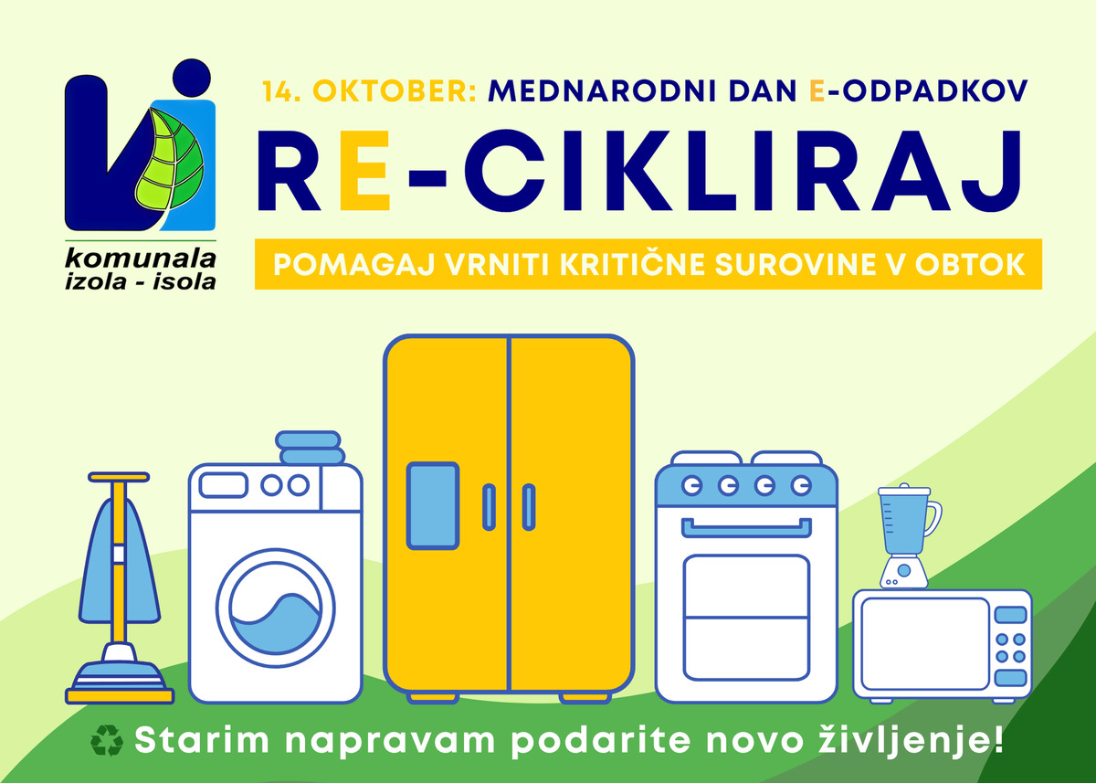 Ob mednarodnem dnevu e-odpadkov vas vabimo, da premislite, kaj se zgodi z vašimi starimi elektronskimi napravami. Ker je odlaganje e-odpadkov med mešane odpadke prepovedano, za njihovo pravilno oddajo izberite eno od navedenih možnosti, ki jih nudimo v Izoli. S tem boste prispevali k varovanju okolja in učinkovitemu recikliranju dragocenih surovin.